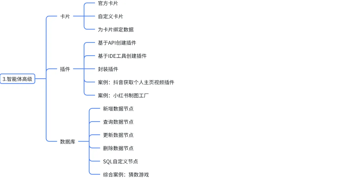 课程设计这块内容,主要是为了进一步完善一个智能体的功能,主要涉及到卡片、插件和数据库的知识。每个知识点讲解完毕后都会给出对应的实战案例(下图列举了部分)来加强实操。