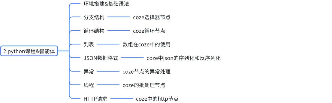 我们是有必要简单学习一下python知识的,这样有利于大家更好的理解智能体相关技术,从而方便后续智能体项目的开发。至于python课程的难度会根据班级学生的情况进行调整,但主体核心内容如下图所示。