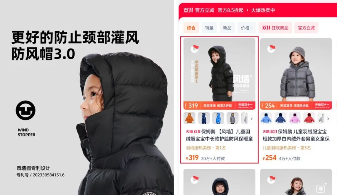 在天猫品牌店上,保姆鹅店铺回购第一名的经典“风墙”系列,券后售价319元,累计销售20万件。