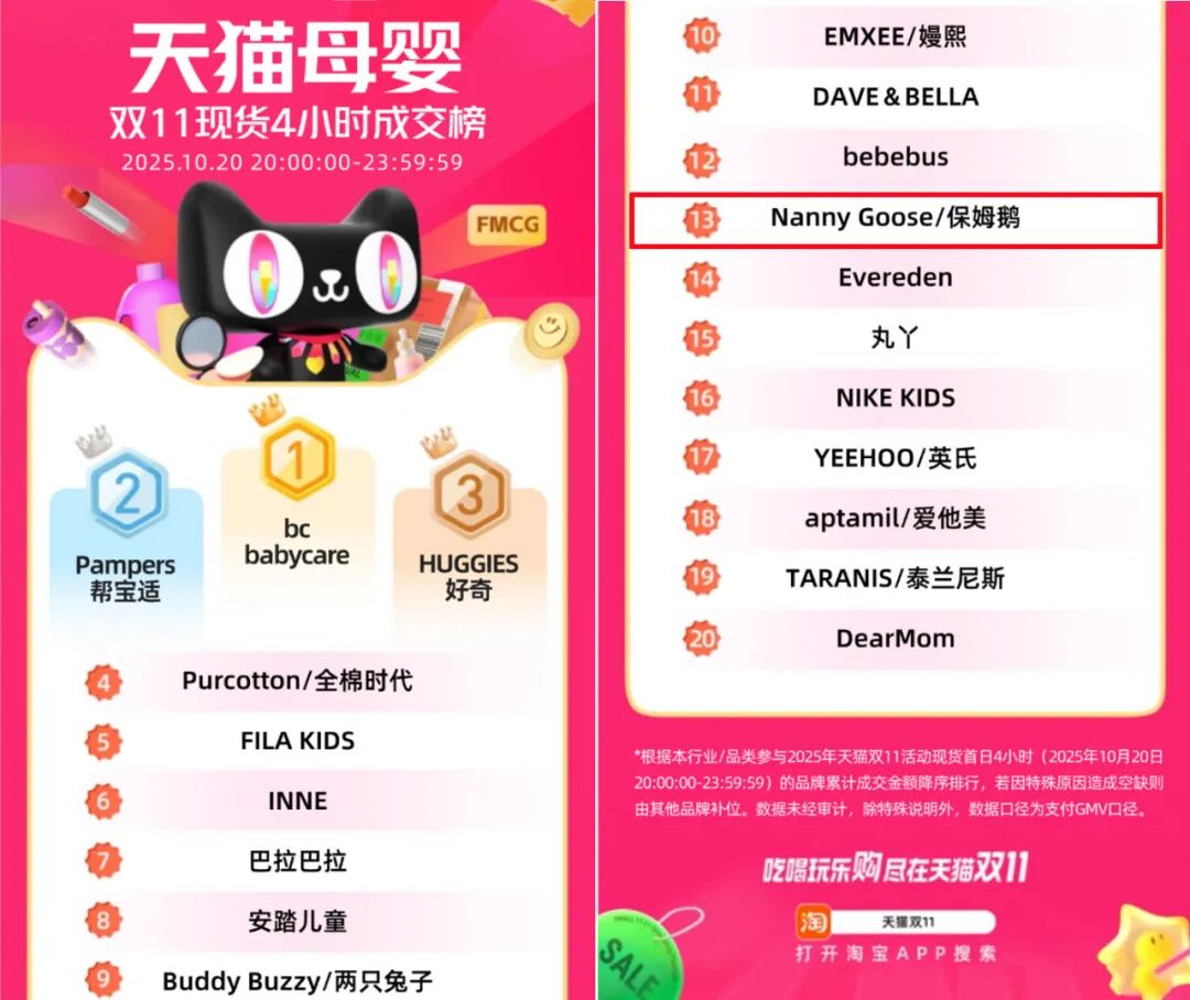 在现货4小时成交榜上,其位列母婴榜单第13位,童装细分赛道第六位。知衣科技统计,10月20日尾款首日,保姆鹅位列童装榜前三,仅次于巴拉巴拉和戴维贝拉。